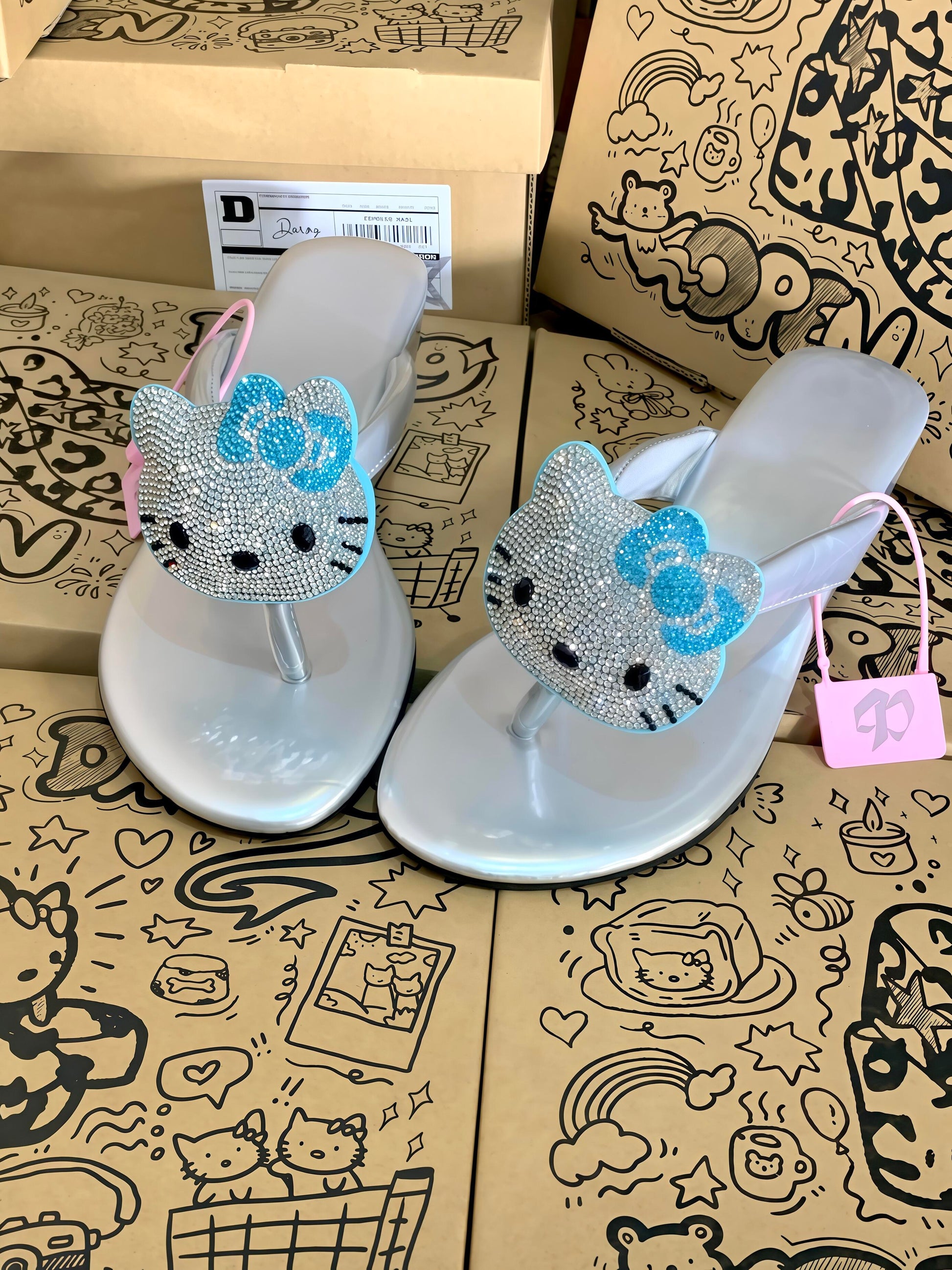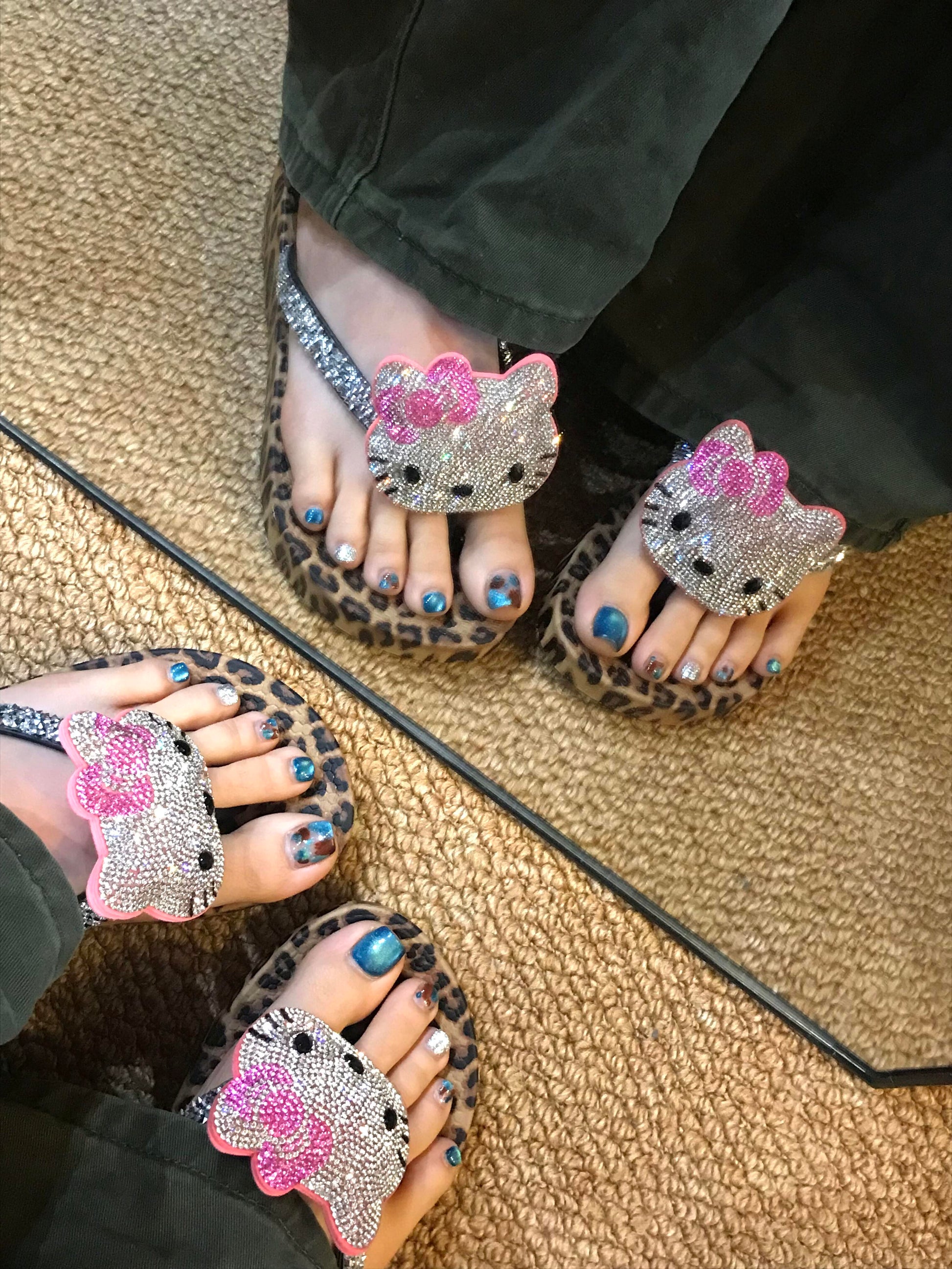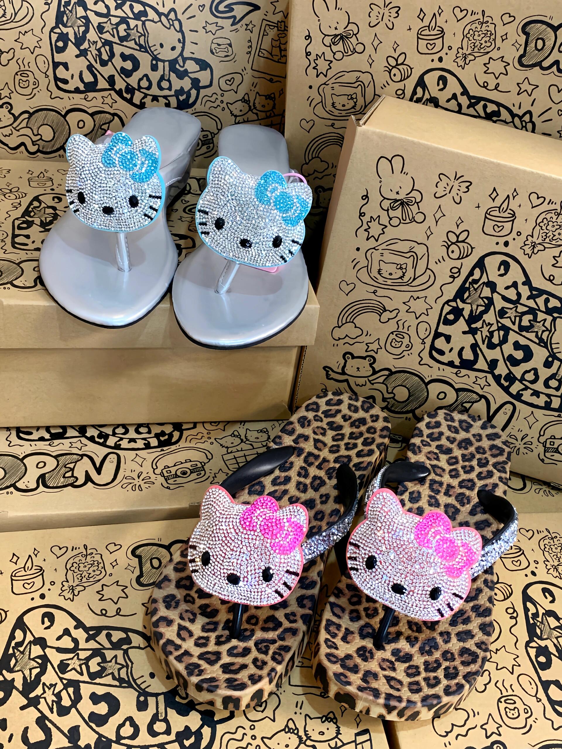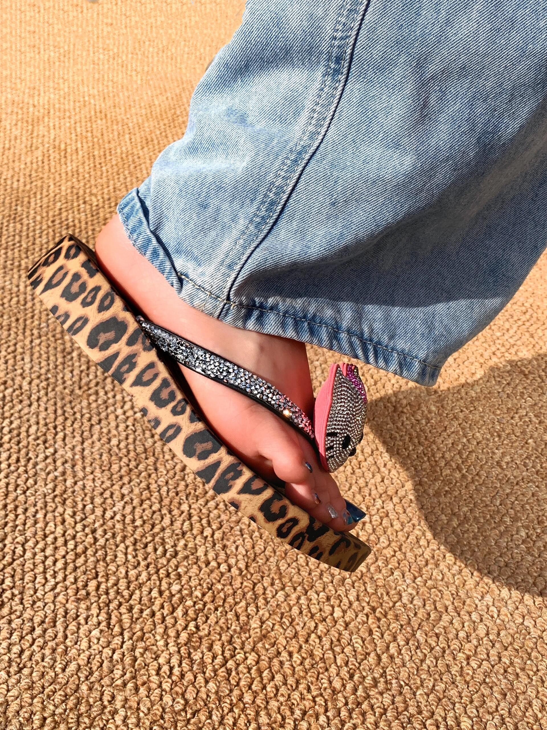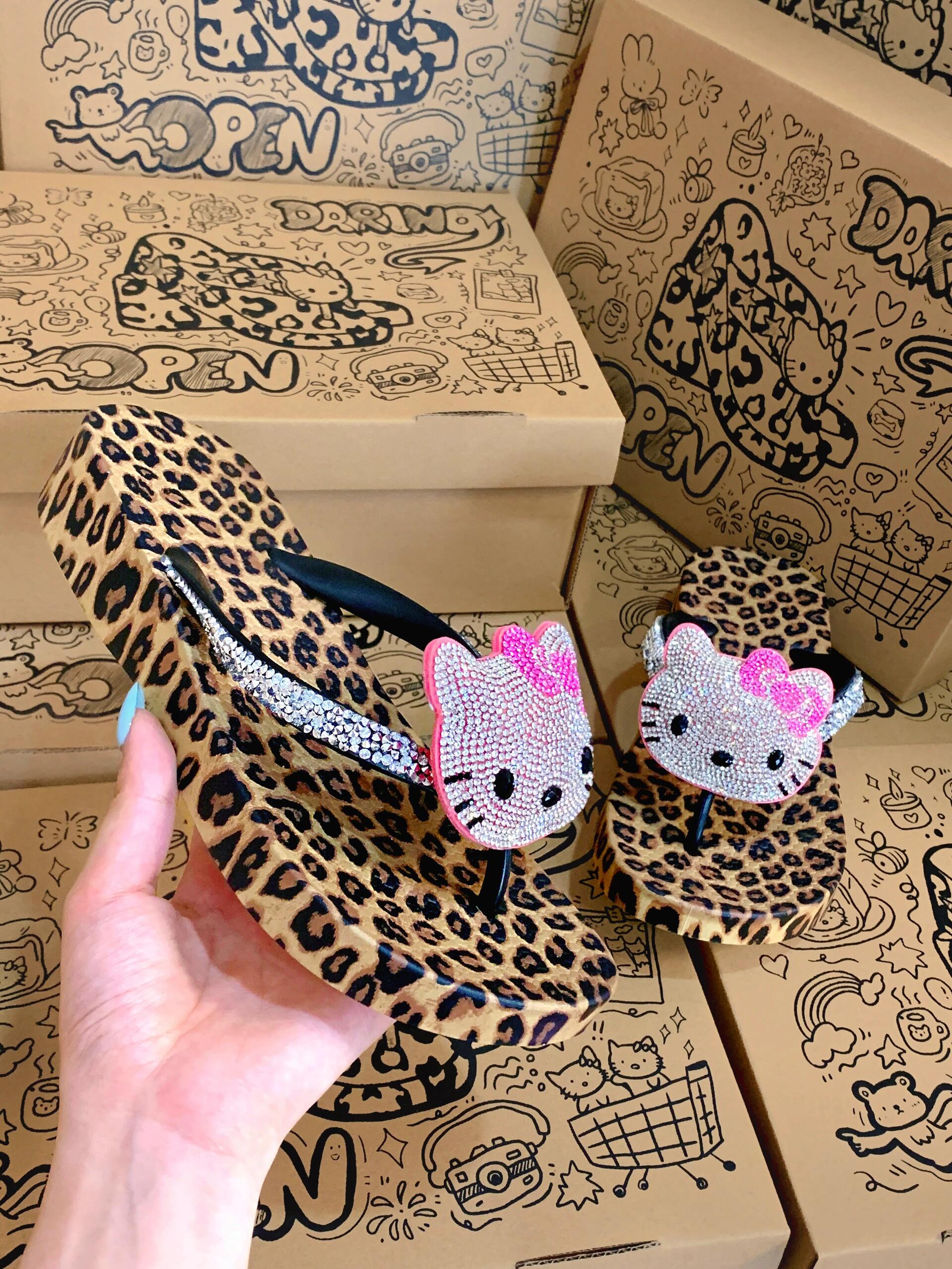 Hellokitty Handmade Rhinestone Leopard Print Women's Sandals Cute Slippers Non-Slip Flip Flops Low-Heeled Slippers