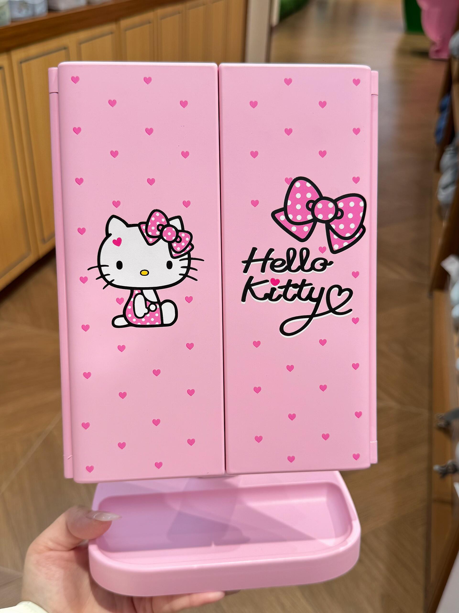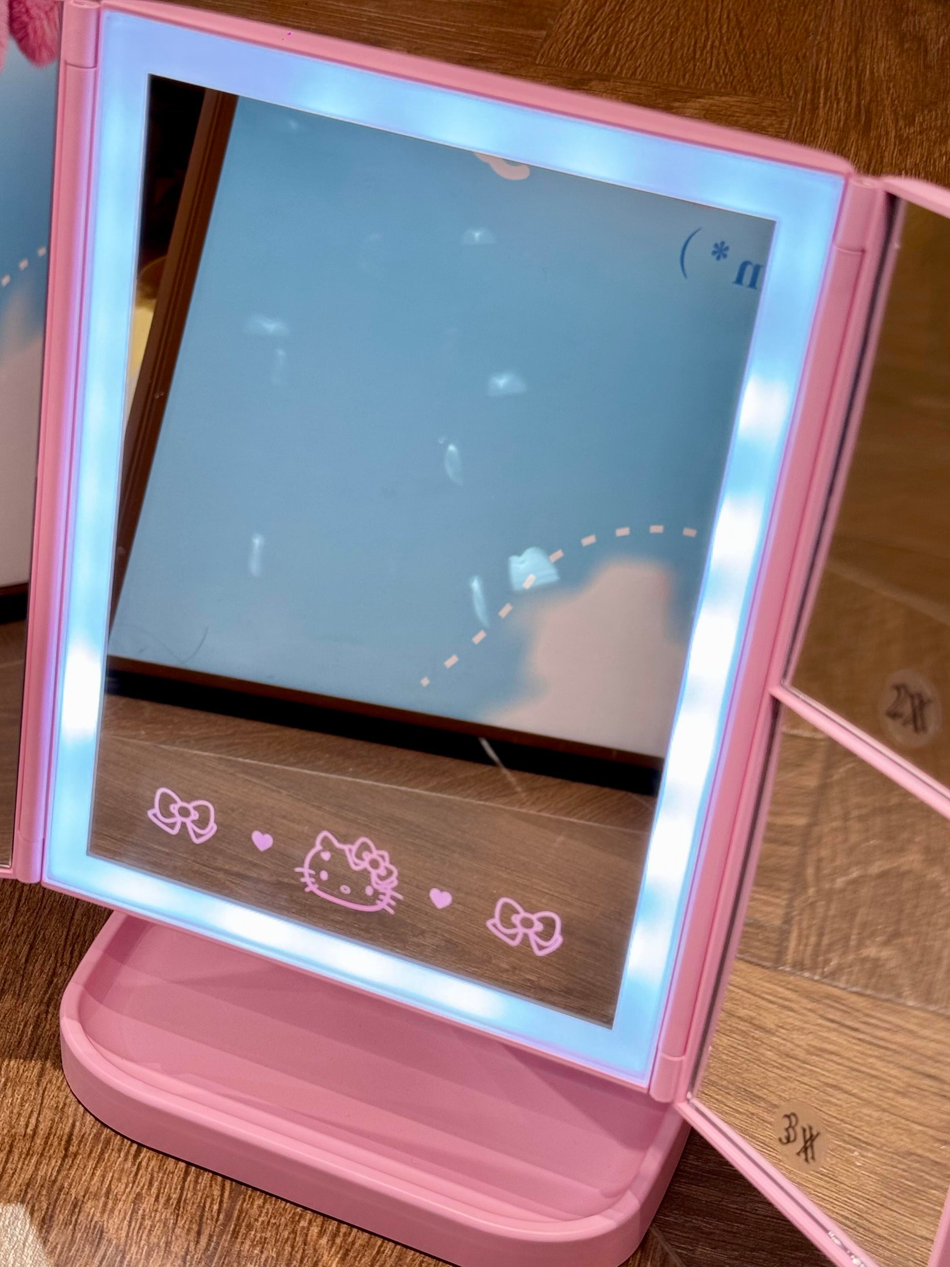 Hellokitty Pink Dresser Mount Tri-Fold Lighted Vanity Mirror with LED Lights, Touch Screen and 3X/2X/1X Magnification, Make Up Mirror,Travel Mirror
