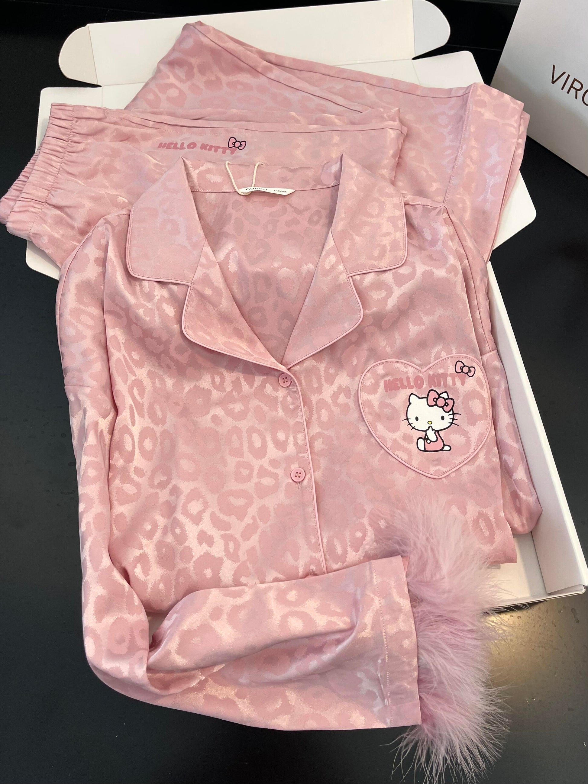 Hellokitty Pink Leopard Print Satin Women's Pajamas Long Sleeve Sleepwear Button Down Loungewear Soft Pjs Set