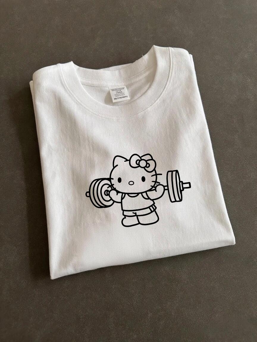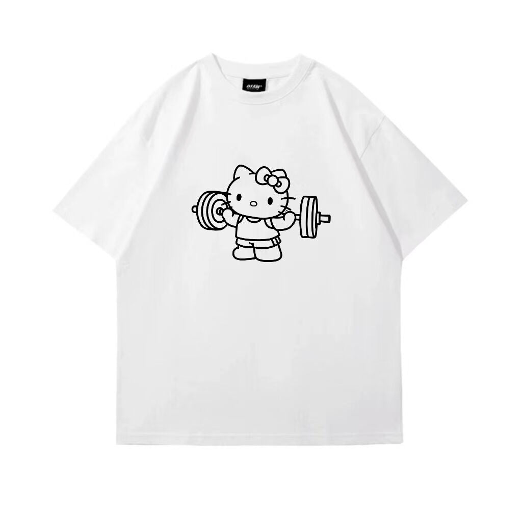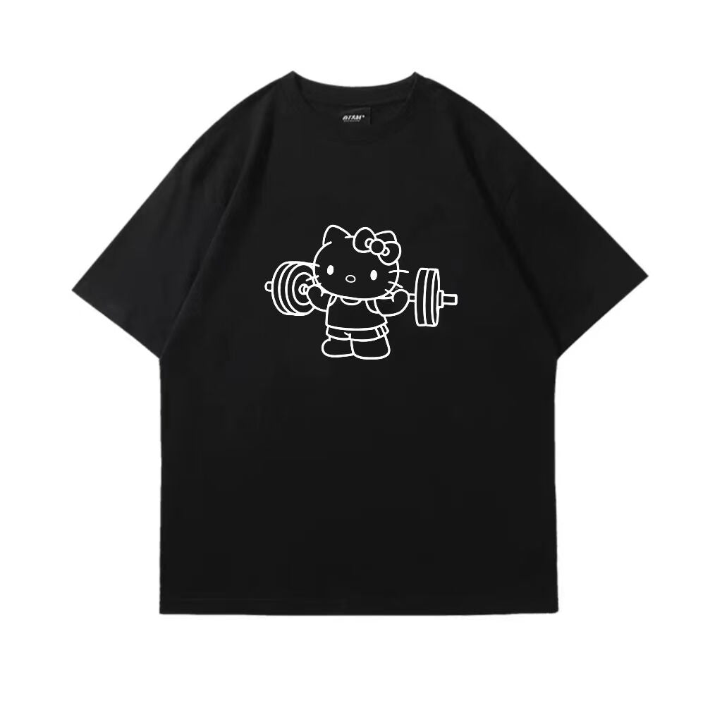 Hellokitty Weightlifting Print Cute Workout Crew Neck Cotton Short Sleeve Gym Fitness