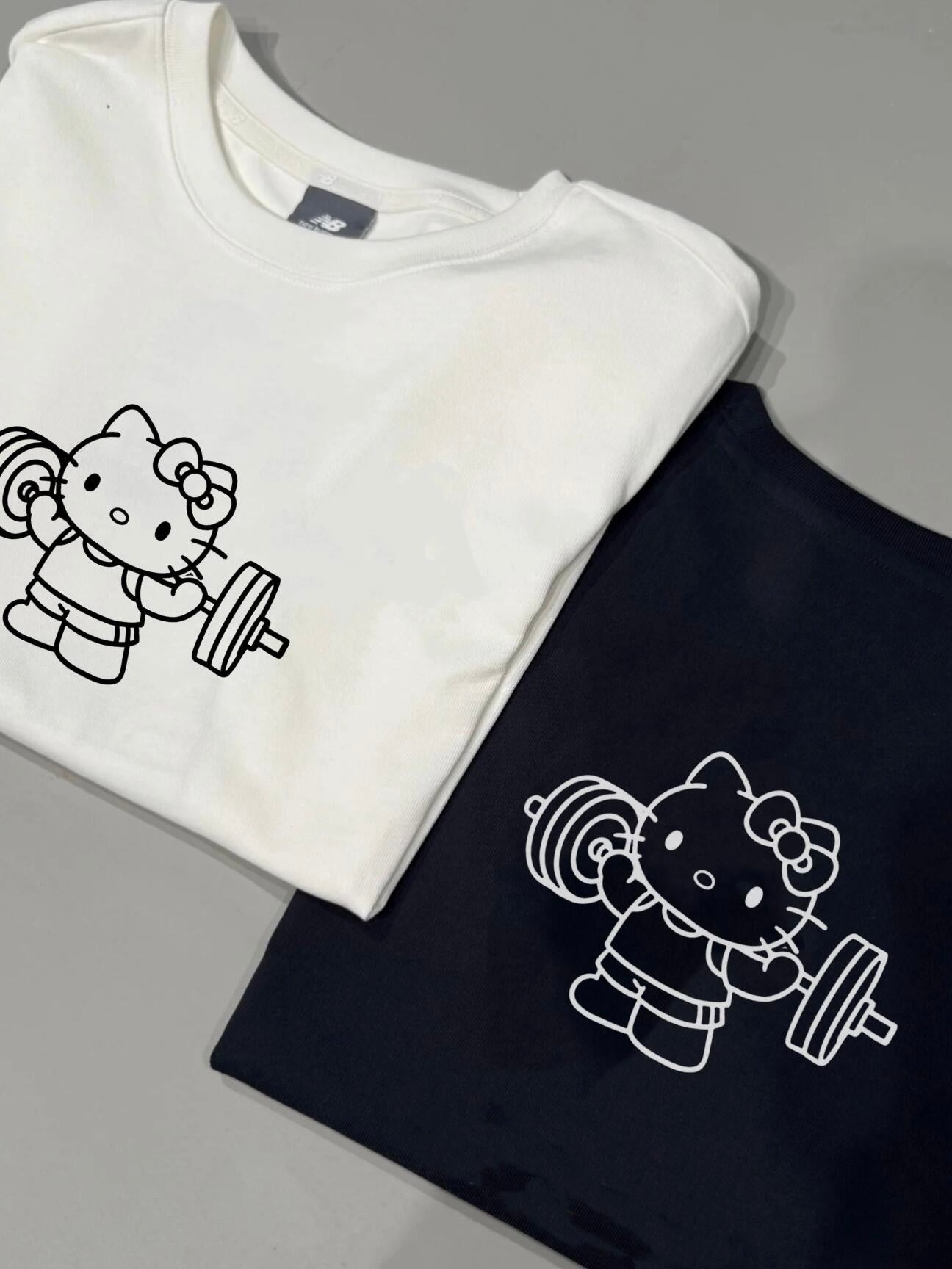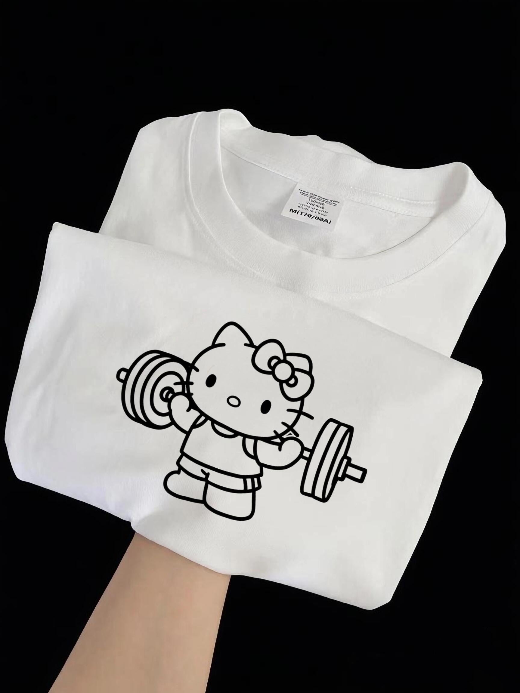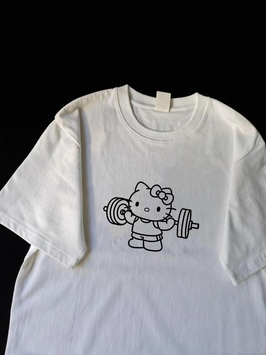 Hellokitty Weightlifting Print Cute Workout Crew Neck Cotton Short Sleeve Gym Fitness